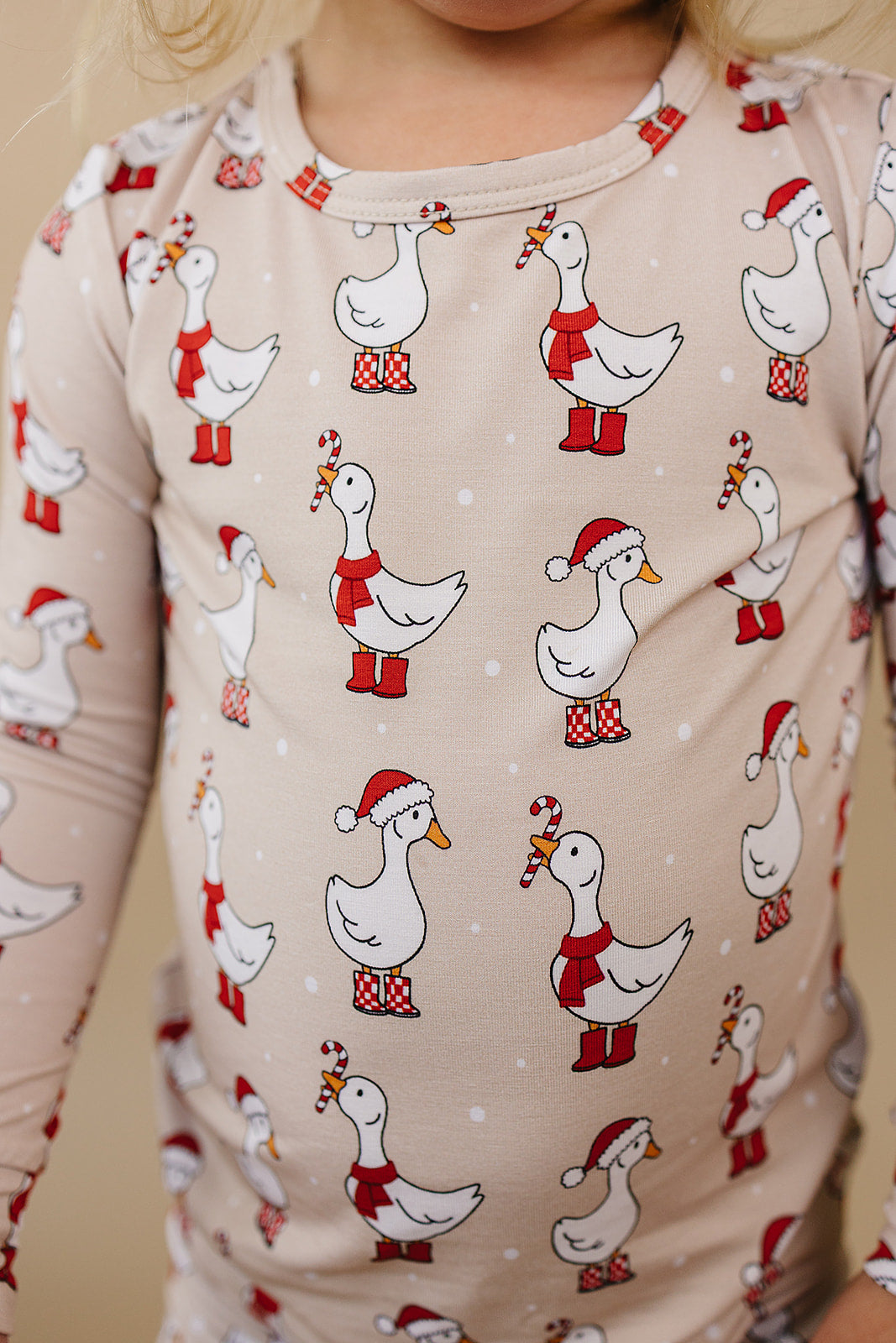 Wrap your little one in holiday cheer with the Bamboo Two Piece Set | Merry Goose. Adorned with delightful geese in their festive best, this soft and stretchy bamboo set adds a whimsical touch to your child’s Christmas wardrobe. Perfect for story time, family photos, or cozy nights at home, it’s comfort and cuteness all season long.
