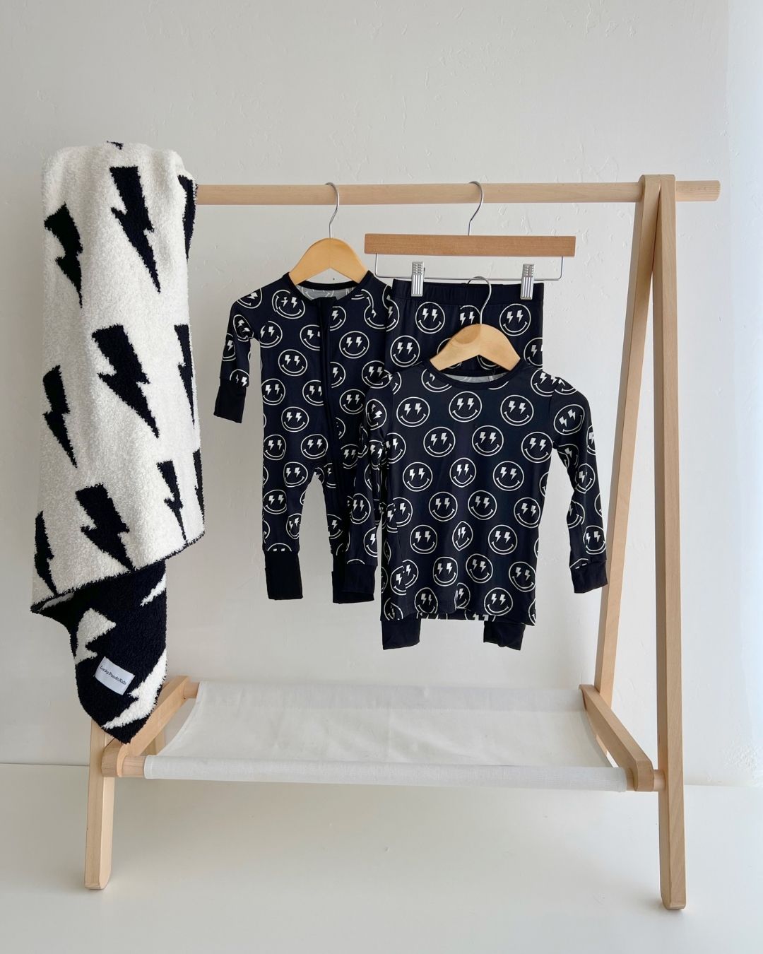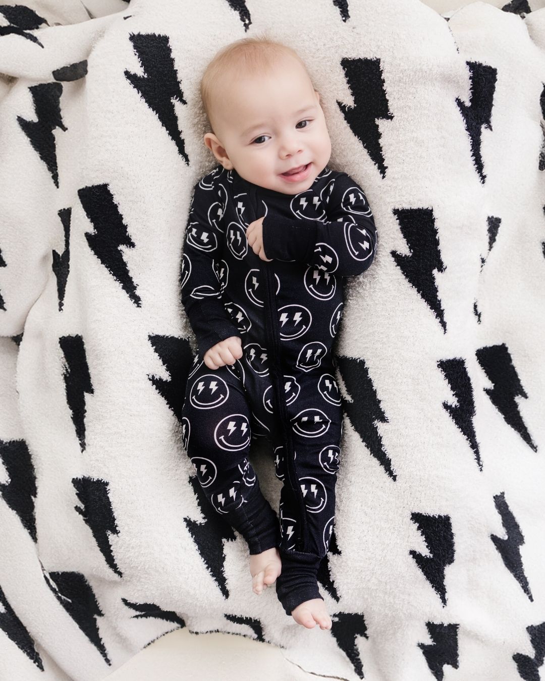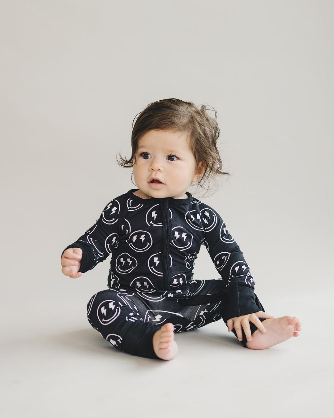 Electric Smiley for a rad little cutie! Super-soft and stretchy, featuring fold-over mittens and footies up to 12-18M. Diaper changes are a breeze with the two-way zipper. Your little one will stay cozy and comfortable, whether it's playtime, nap time, or cuddle time.