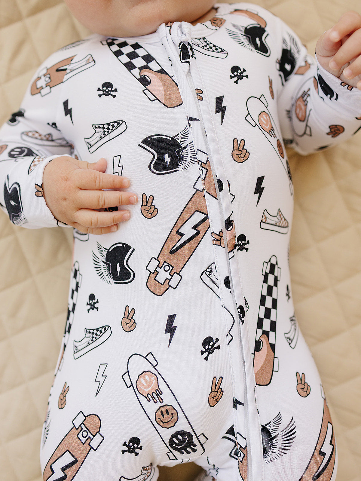 Bold boards, cool kicks, and cozy bamboo fabric—the Bamboo Zip Romper | Sk8er has it all.