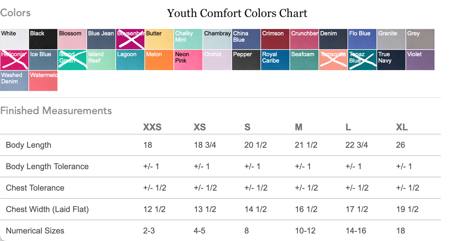 - Color shown is Comfort Colors. Gildan brand is available, these are ultra/heavy cotton. Color charts vary by brand.