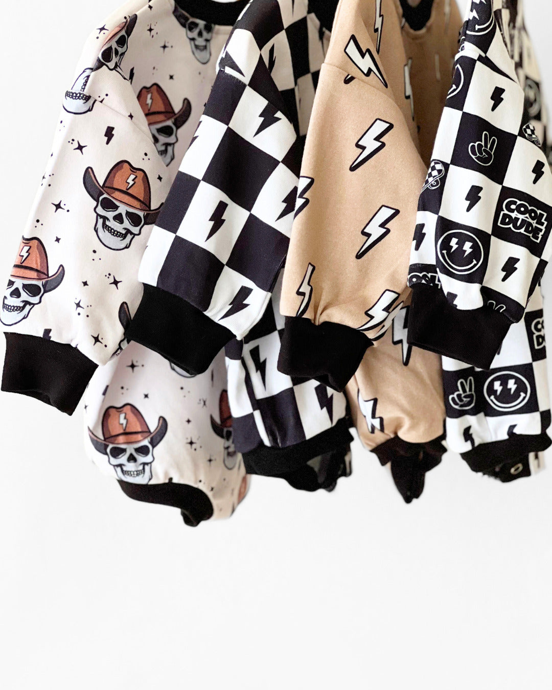 Introducing the Charcoal Bolts bubble romper—a perfect blend of vintage charm and modern style. The dusty black printed lightning bolts add a cool, edgy touch to this long sleeve romper. Crafted from a soft, stretchy fabric of 95% cotton and 5% spandex, it ensures all-day comfort for your little trendsetter.
