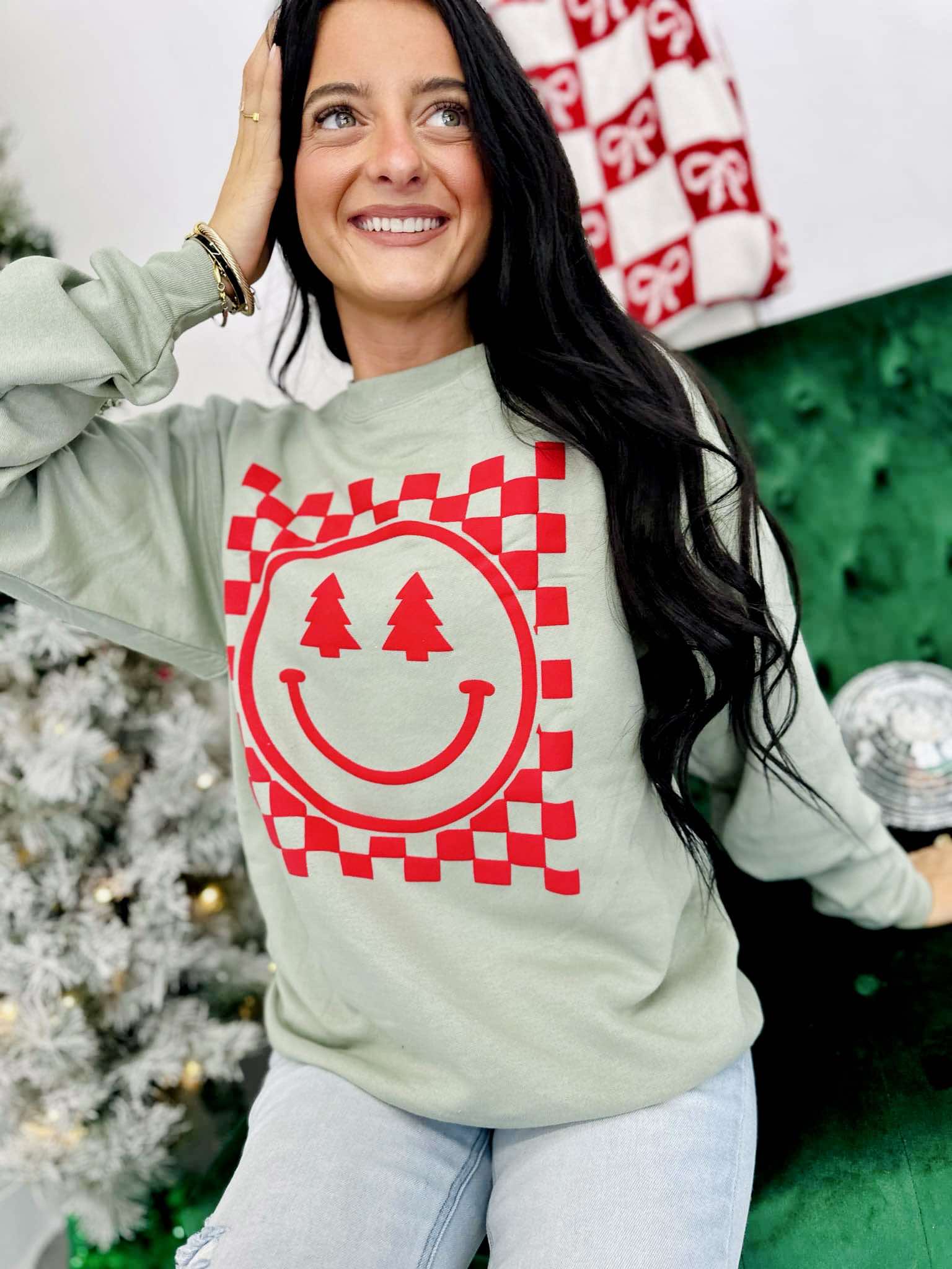 Checkered Happy Face Tree Eyes Puff Sweatshirt