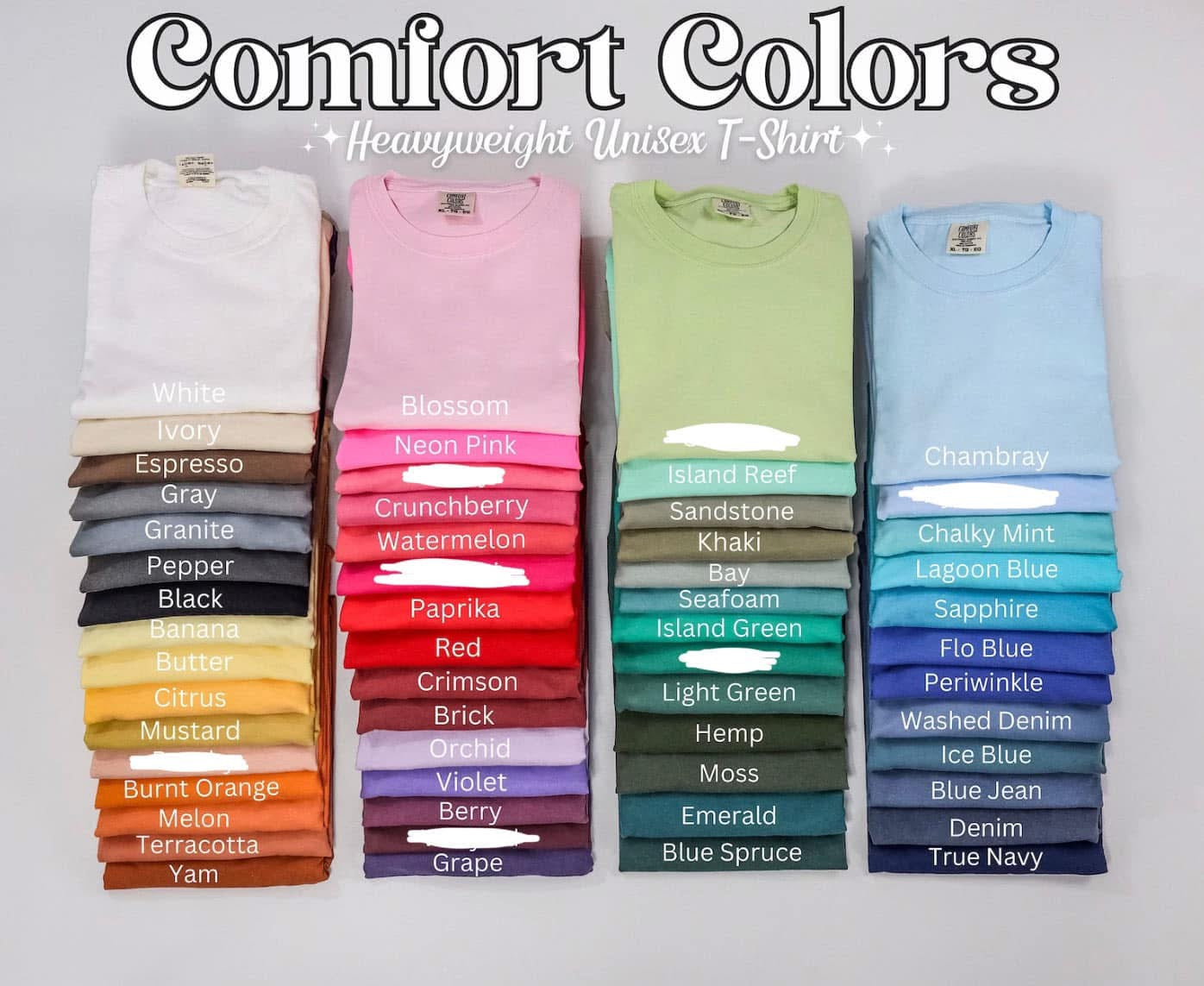 - Comfort Colors as pictured and Tultex/Gildan or comparable is offered as well, color variations may occur, but they will be as close as possible.