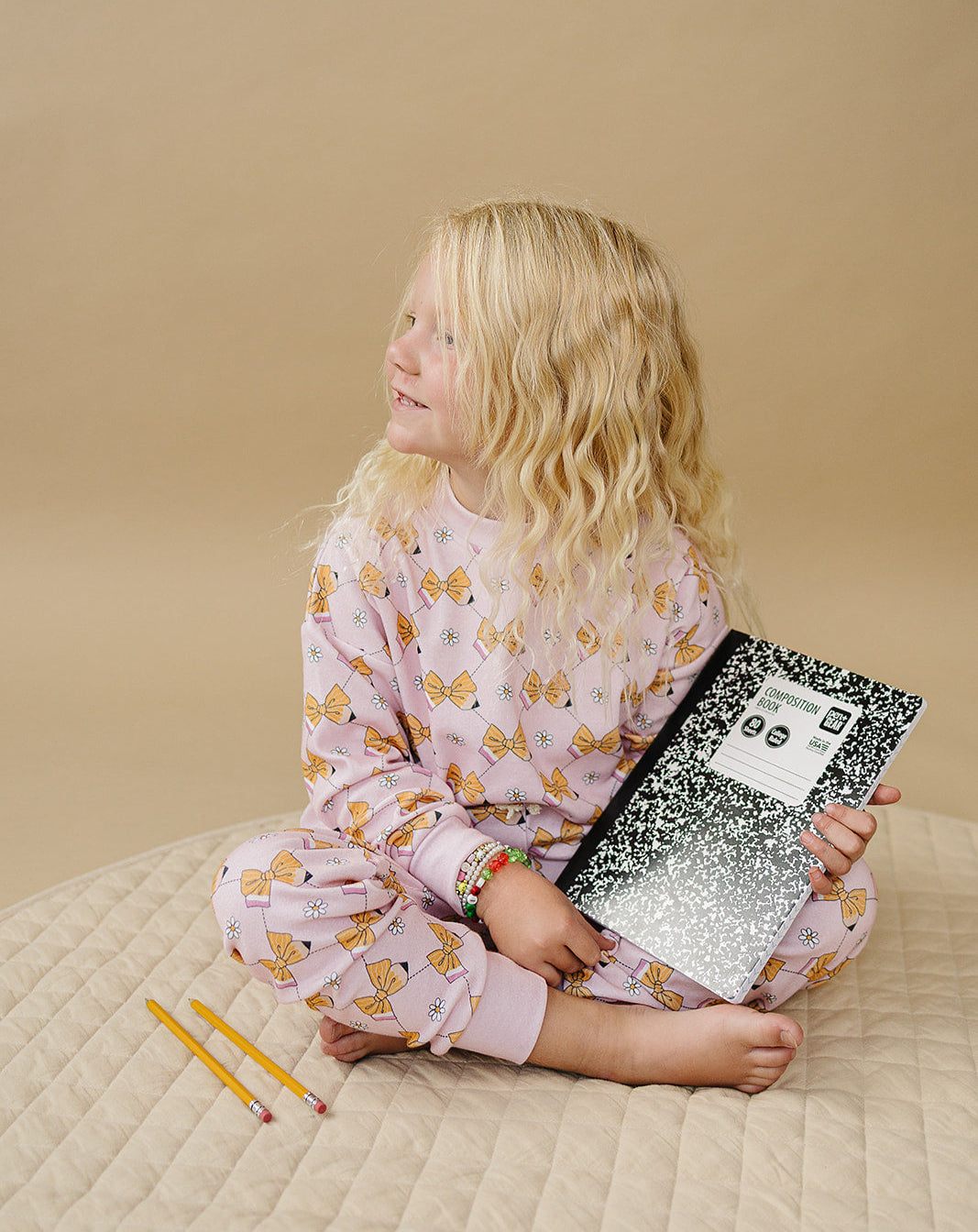 Pencil bows, daisy doodles, and the dreamiest shade of pink. The Jogger Set | Pixie Pencil is ready for recess, reading time, and after school snuggles.