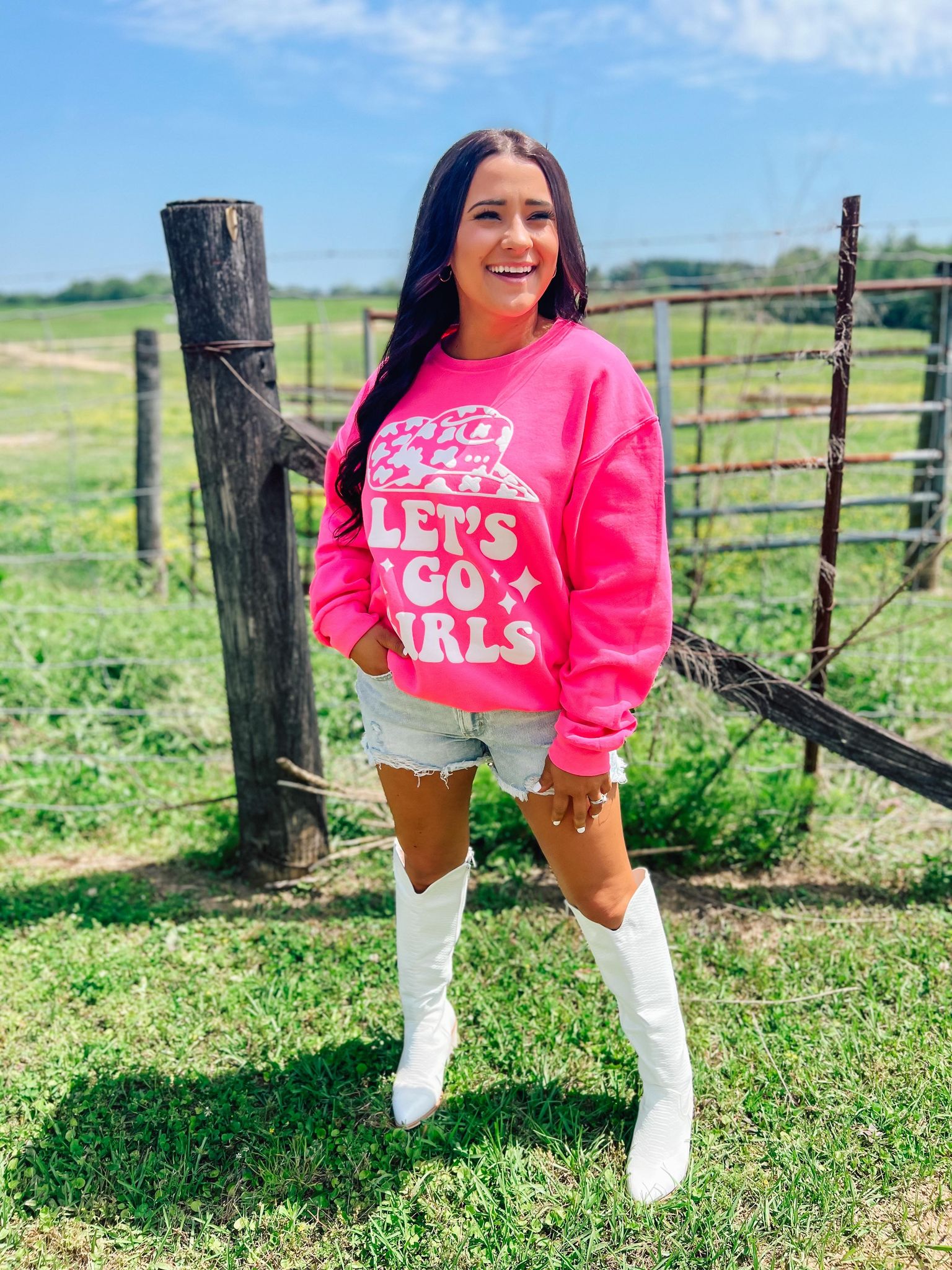 Lets Go Girls Cow Print Hat Puff Sweatshirt