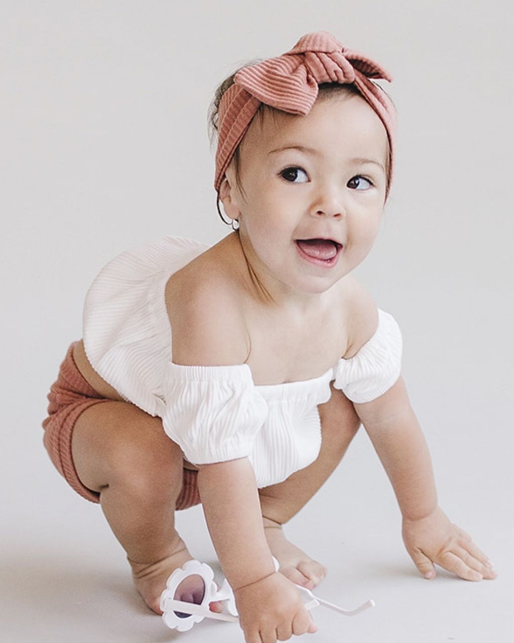 Your baby girl's wardrobe is about to get cuter than ever! Our two-piece ribbed shorts set in dusty rose is all the rage and it's no wonder—it features unique off the shoulder puff sleeves with comfy ribbed cotton for all-day play.