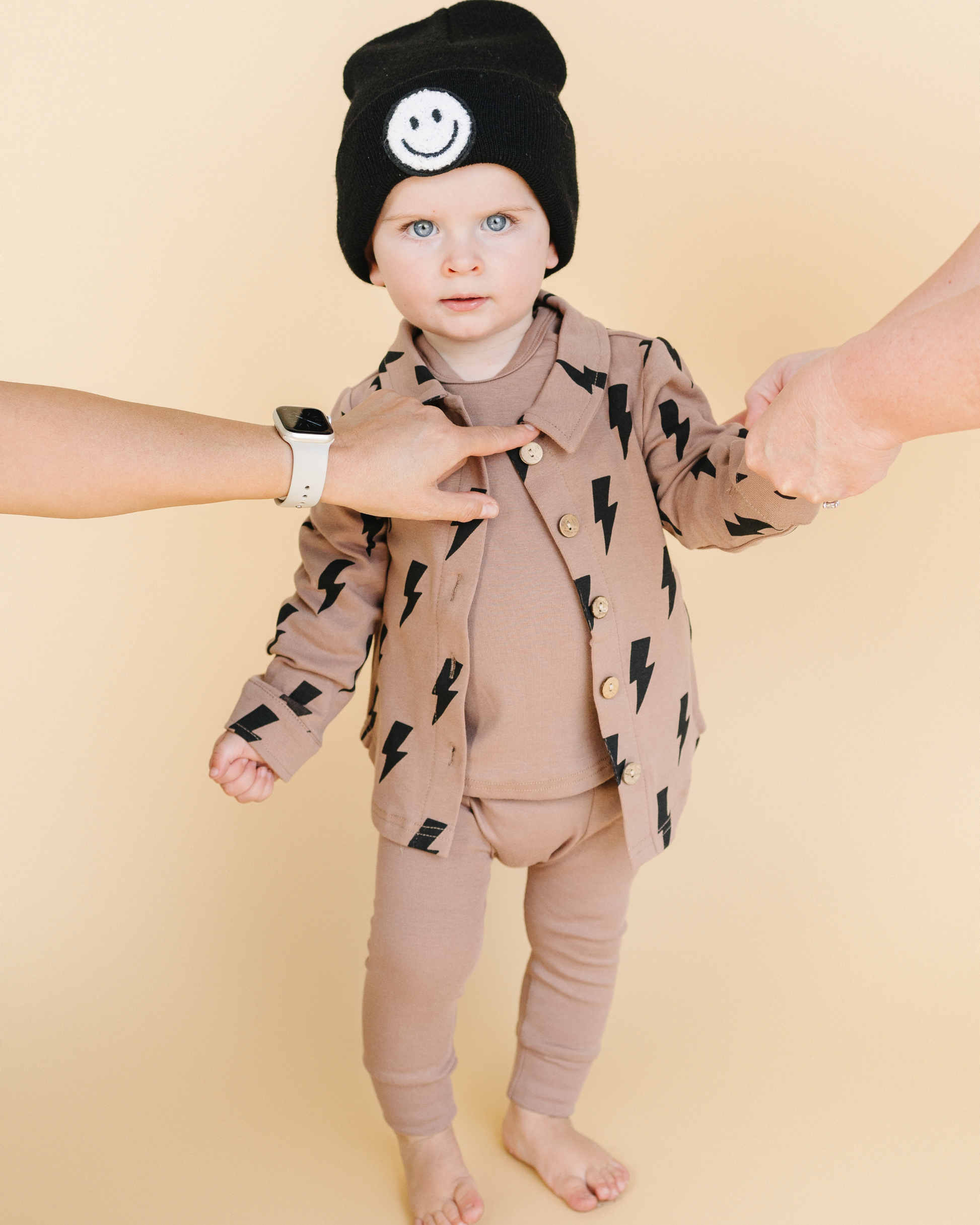 It's shacket season! Made with a soft cotton fabric and great for layering or wearing it alone. With a functional button closure at the front, you can easily switch between keeping it casual or dressing it up, making it the versatile addition your wardrobe needs. Combine with our new "Mocha Smiley Lounge Set" and Smiley beanie to complete the look! Available from newborn to 9Y.