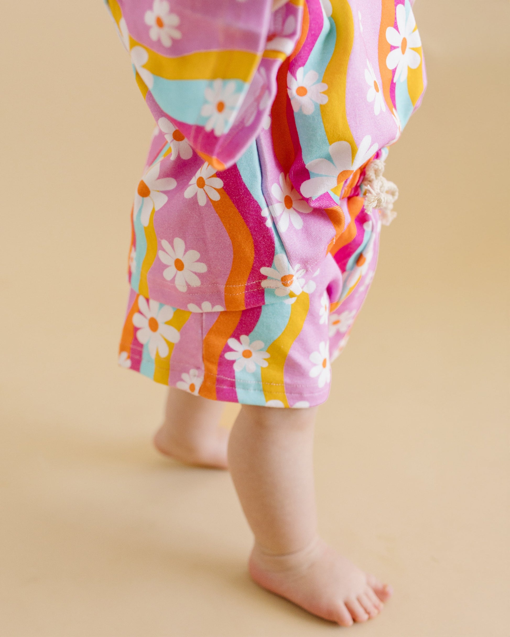 Bring the sunshine wherever you go with our Groovy Daisy shorts set! Featuring a vibrant floral print in a stunning mix of colors, this set is perfect for any day spent in the sun. Whether you're lounging at home or enjoying a day out, this playful, bold design will make sure your little one stands out with style.