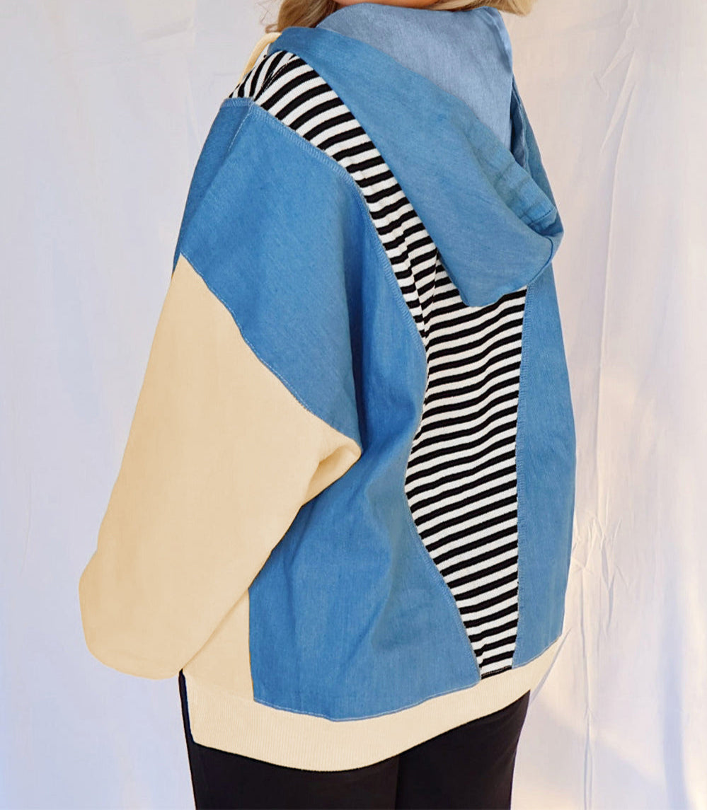 Stay effortlessly stylish with this Stripe Denim Colorblock Hoodie LT. Featuring a unique patchwork design that combines classic denim, bold stripes, and contrasting blocks, this oversized quarter-zip pullover offers both comfort and a modern edge. Its relaxed fit ensures easy layering while creating a slim, fashionable silhouette. Perfect for casual wear, this hoodie adds a distinctive touch to any wardrobe.