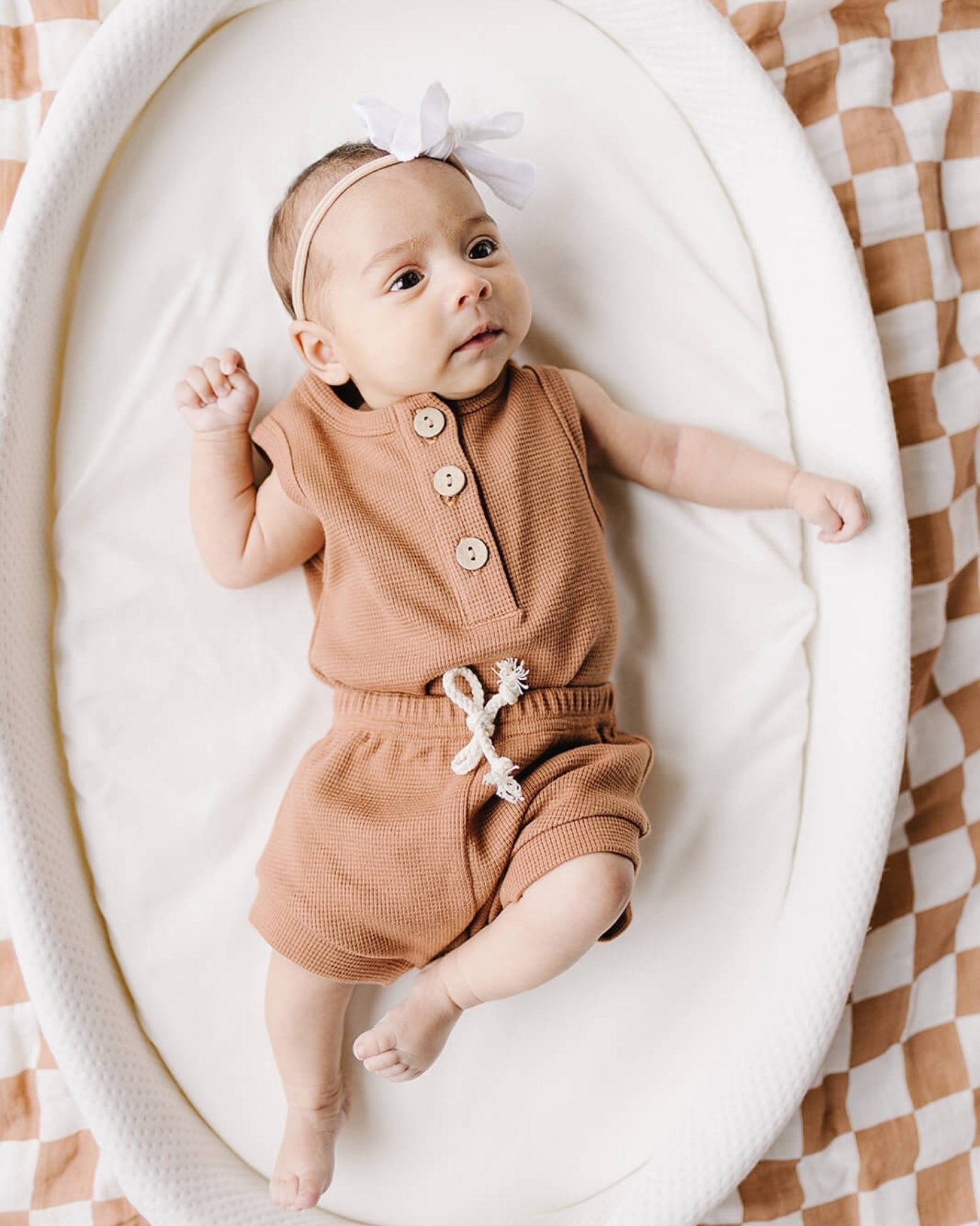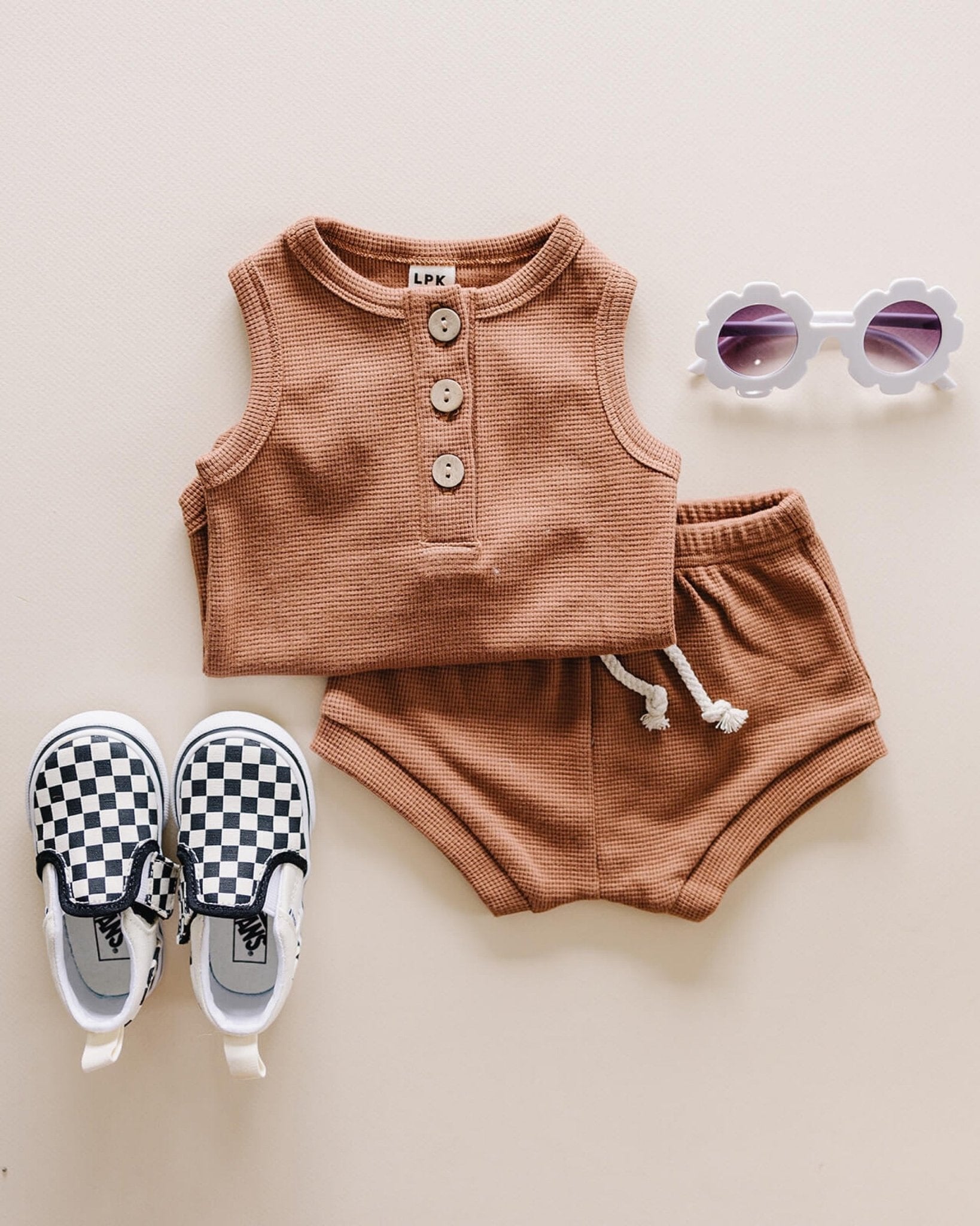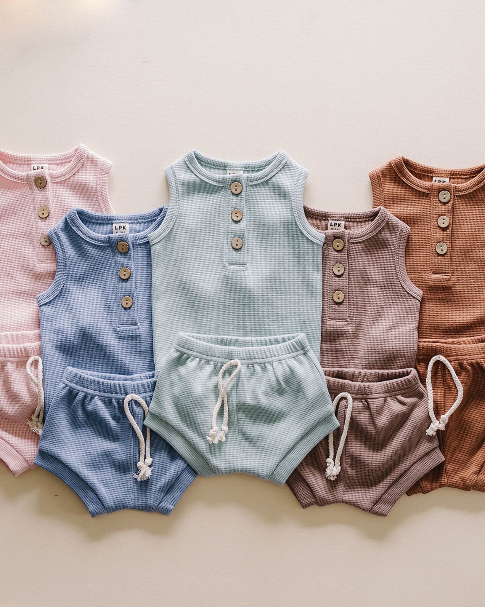 Beautiful high quality waffle cotton fabric matching set. Includes a onesie detailed with 3 wood buttons at the top, and matching shorts with an elastic waistband.
