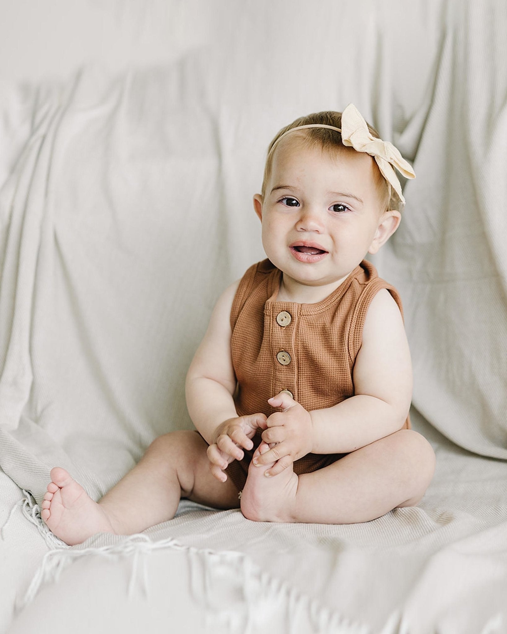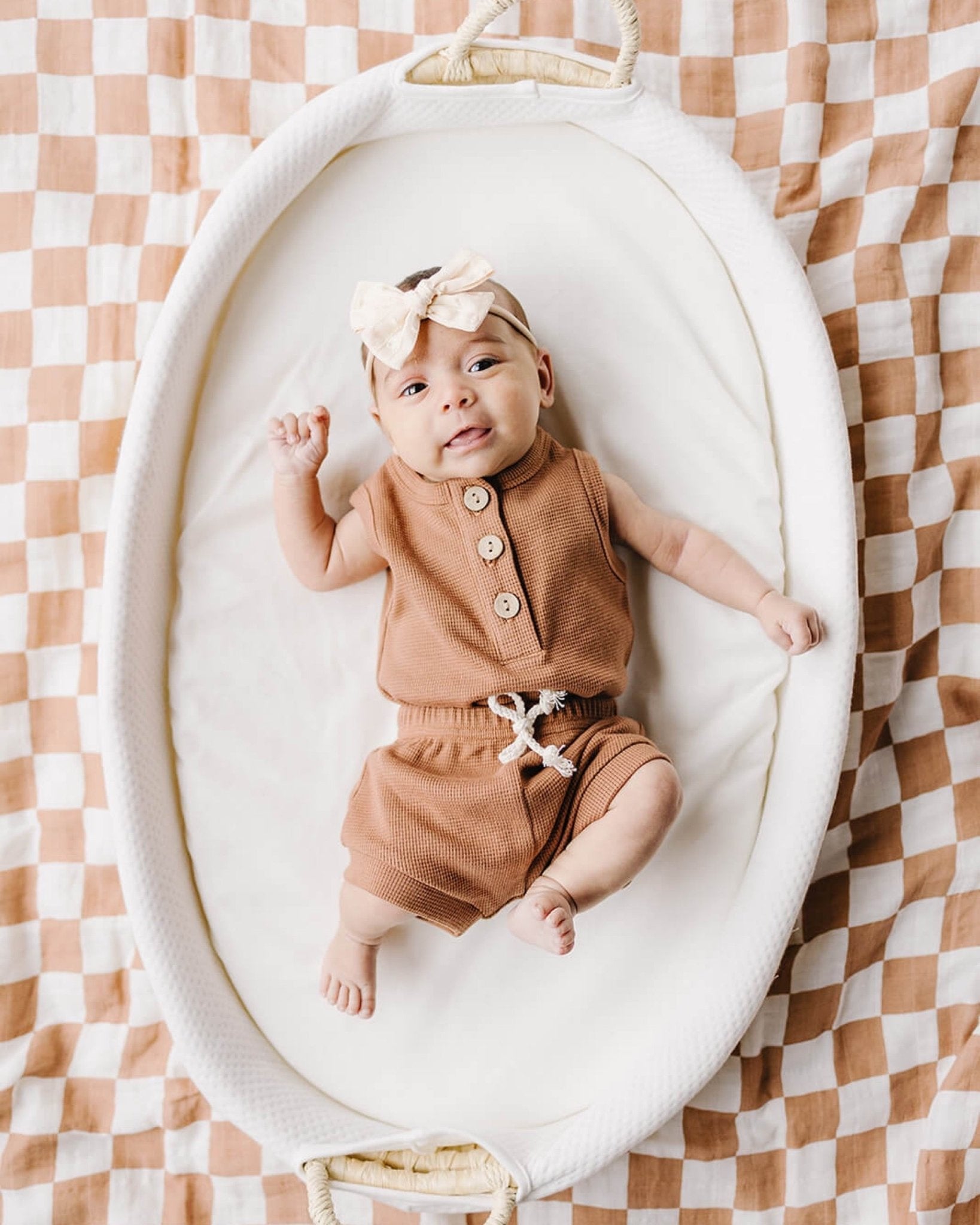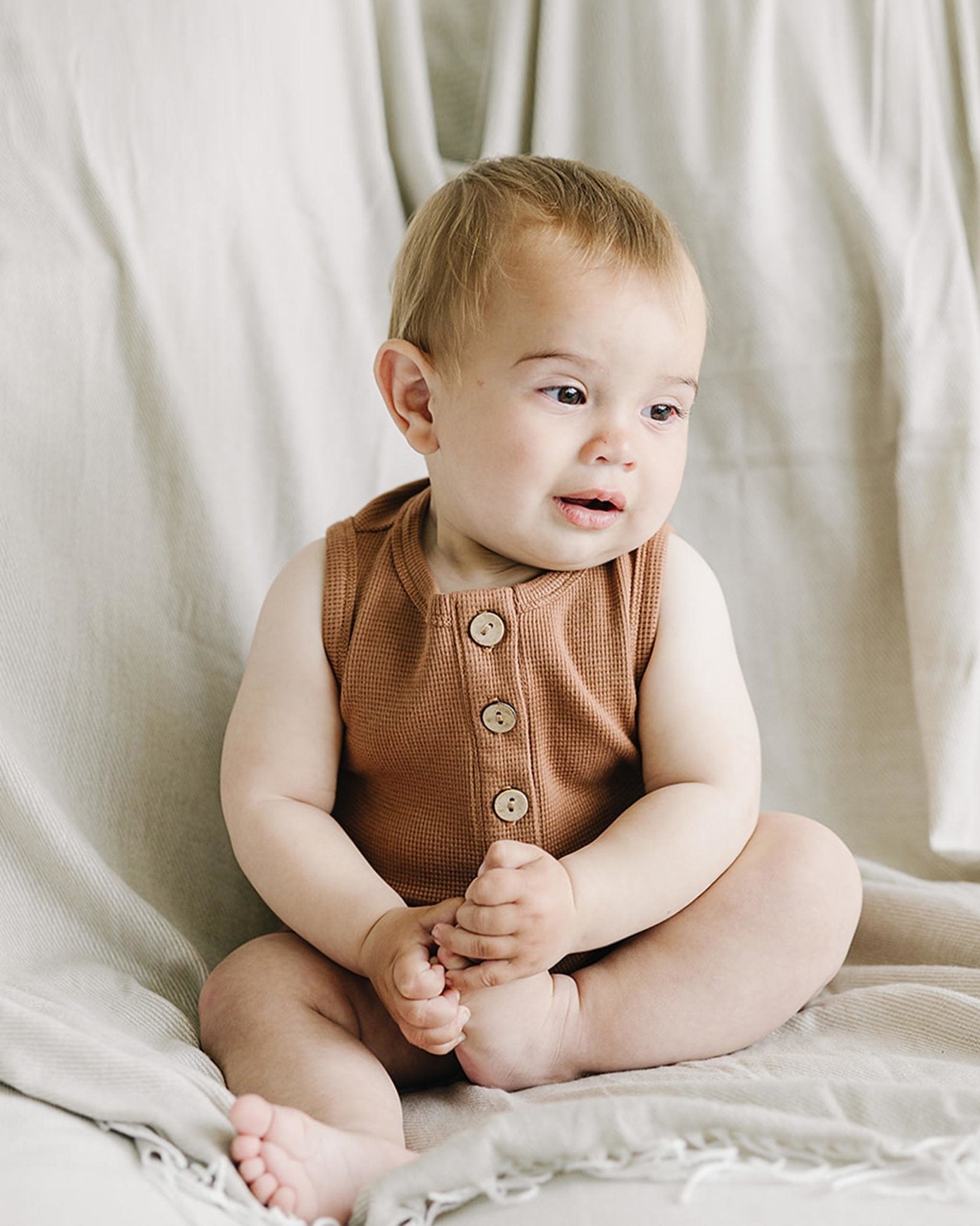 Beautiful high quality waffle cotton fabric matching set. Includes a onesie detailed with 3 wood buttons at the top, and matching shorts with an elastic waistband.